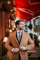 Abrigo recto color Camel confeccionado en 90% lana y 10% cashemere. Presenta solapa, manga larga y cinta ajustable en su parte trasera. Forro interior de color azul marino con bolsillo interior. Fabricado en España.
