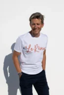Camiseta de color blanca confeccionada en 100% algodón orgánico. Presenta print de letras de color amarillo en el frontal. Fabricado en España. El modelo mide 1,85m y lleva una talla S.