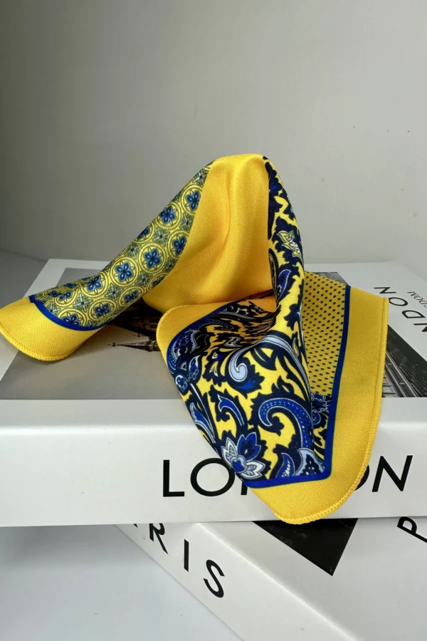 Diseño único en seda con una composición multicolor donde destaca el amarillo. Perfecto para dar luminosidad y personalidad a cualquier look.