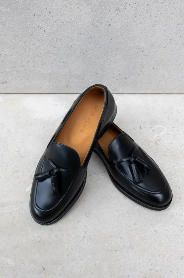 Mocasín de borlas en color negro con un empeine bajo y una puntera